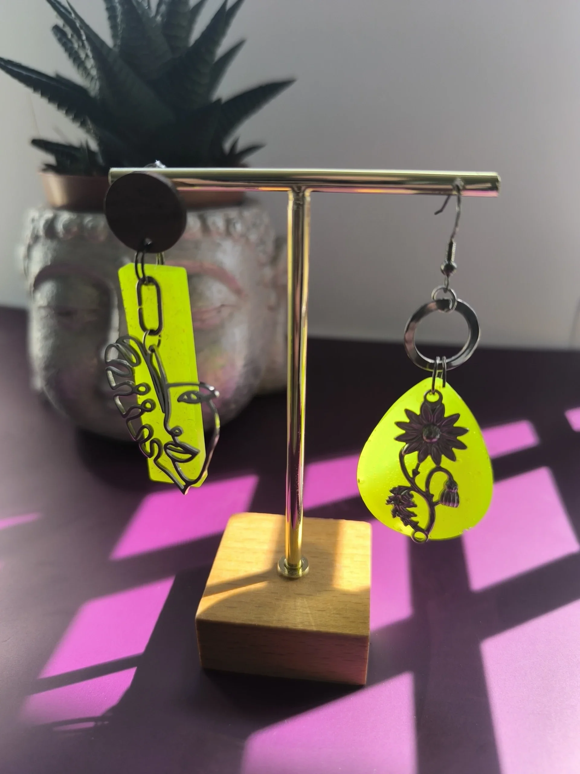 Toutes les boucles d'oreilles sont en acier inoxydable et en argent pour éviter les allergies. Toutes les créations sont porteuses d'intentions positives, ce sont des bijoux énergétiques créés en pièce unique. Il est possible de personnaliser une paire sur demande.
