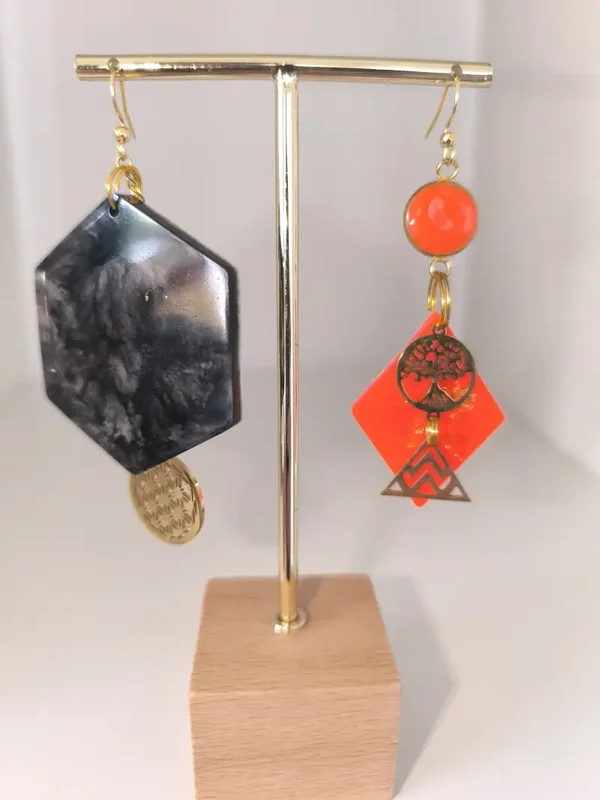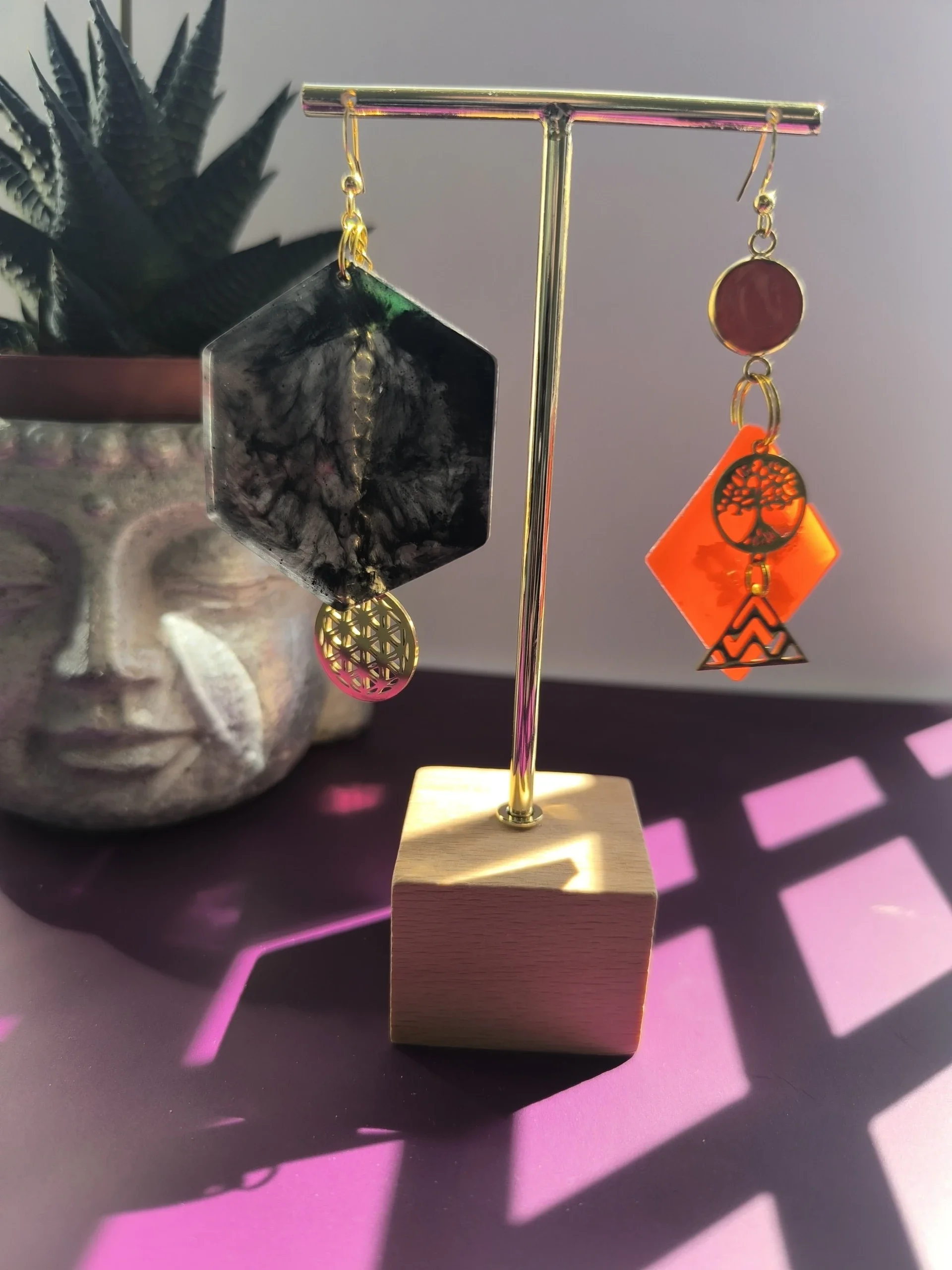 Toutes les boucles d'oreilles sont en acier inoxydable et en argent pour éviter les allergies. Porteuses d'intentions positives, elles sont créées en pièce unique. Il est possible de commander une paire personnalisée.