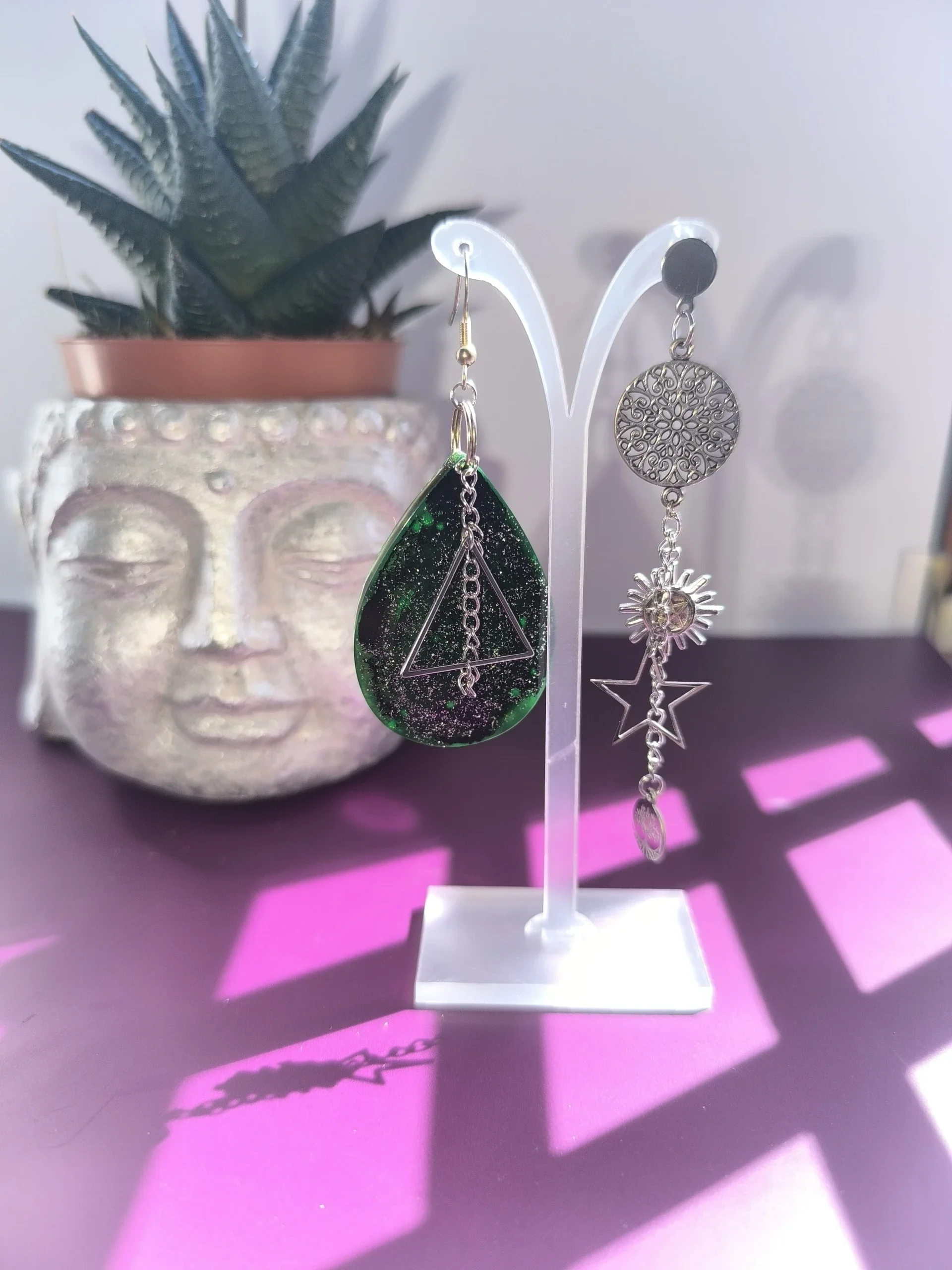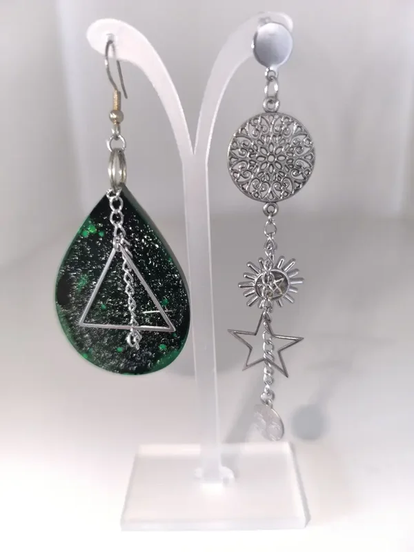 Toutes les boucles d'oreilles sont en acier inoxydable et argent pour éviter les allergies. Chaque création est porteuse d'intentions positives, ce sont des bijoux énergétiques créés en pièce unique. Il est possible de personnaliser une paire sur demande.