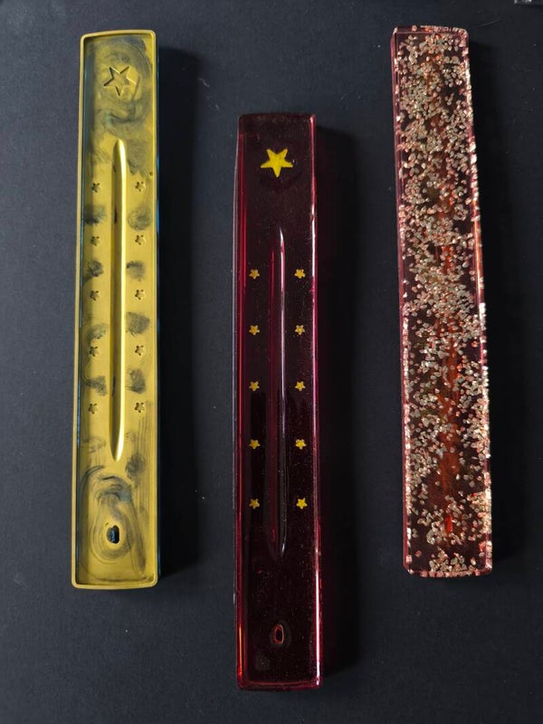 Bleu et doré. En résine époxy. Pour faire brûler les bâtons d'encens. Attention, juste les bâtons, pas les cônes ni l'encens en grains ou en résine !
